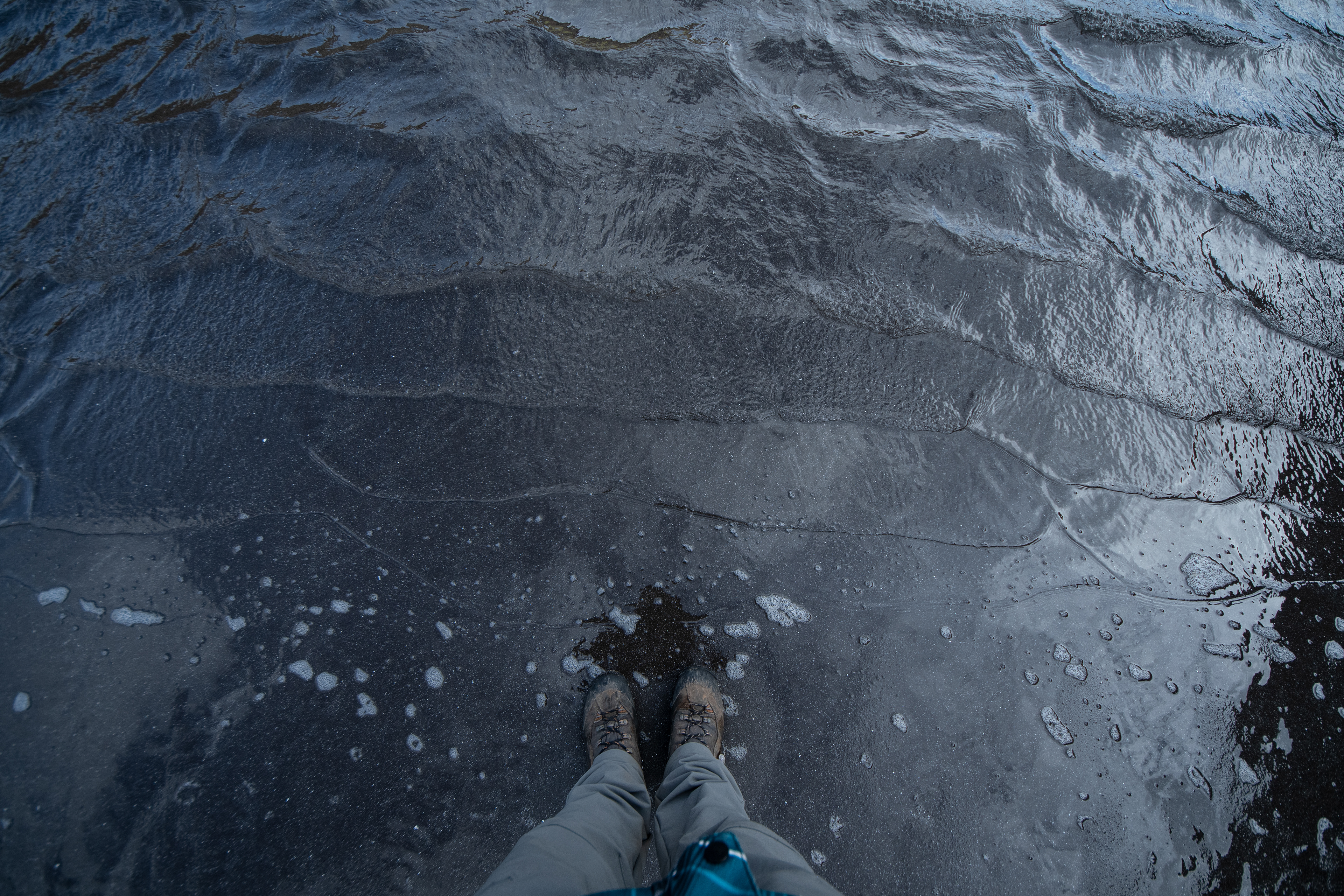 Ci dirigiamo quindi verso l'imbocco da cui la marea entra in questa laguna e, seguendone lo stretto corridoio per qualche centinaia di metri, sbuchiamo su una spiaggia stupenda fatta di sabbia nera e riflessi bianchi. La spiaggia è intonsa e non v'è alcuna traccia di presenza umana, lasciando spazio alla naturale differenziazione dei granuli di sabbia, è bellissimo. Passiamo qualche manciata di minuti scattando fotografie in questo idillio, fatico ad accettare che domani saremo su un aereo per tornare a casa.