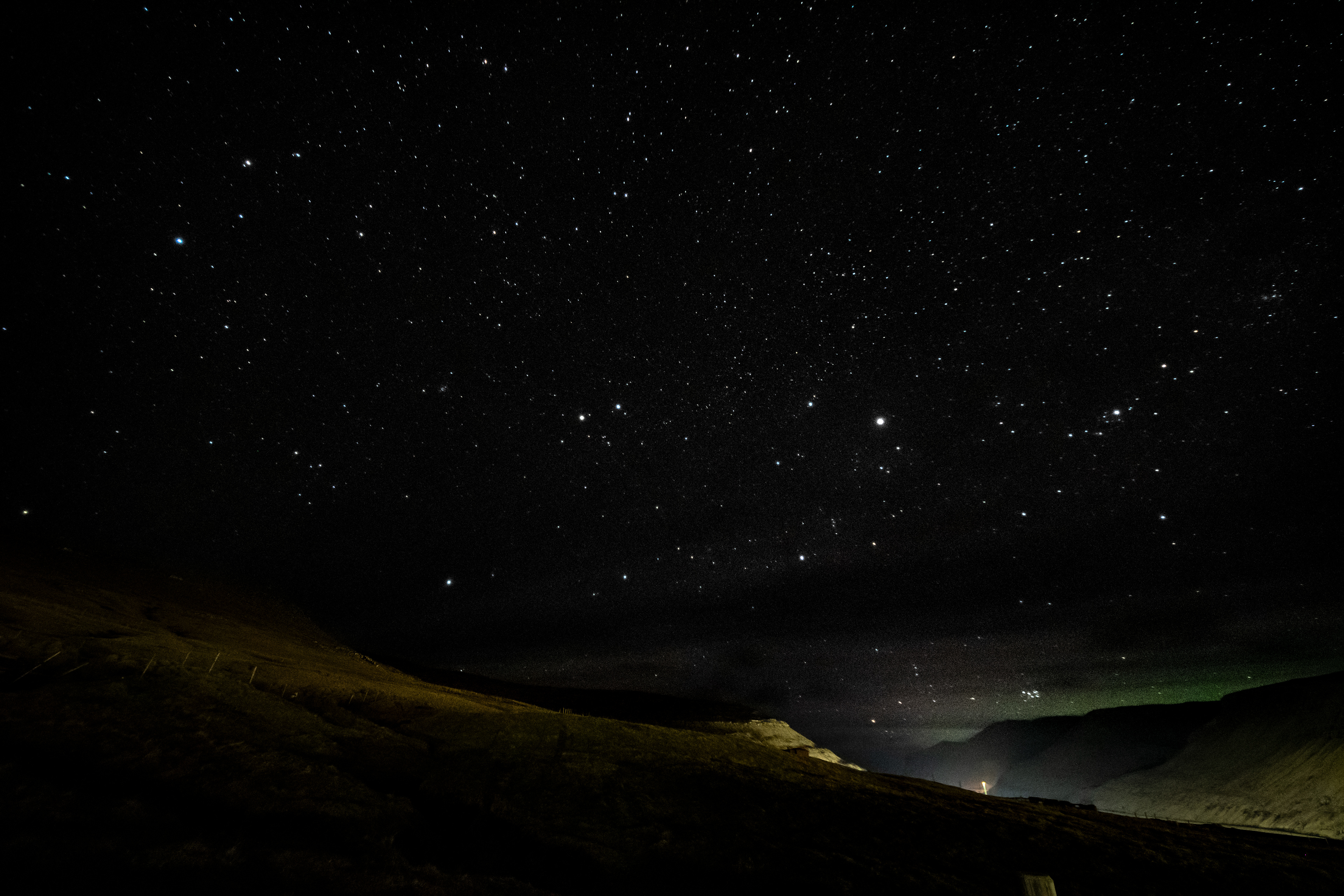 La nottata è leggermente nebbiosa ma le stelle penetrano la foschia con una luce pungente. Purtroppo le vicine luci dell'aeroporto e della città non ci permettono degli scatti perfetti di questo cielo incredibile. Nonostante ciò ci perdiamo nelle ombre dei declivi per diverse ore finché la temperatura, calata molto sotto lo zero, ci spinge a rintanarci in casa. In una delle foto che riesco a scattare noto, verso nord, un lontano alone verdastro che tutt'oggi sono convinto potesse essere una lontana aurora. Così vicina ma ancora lontana.