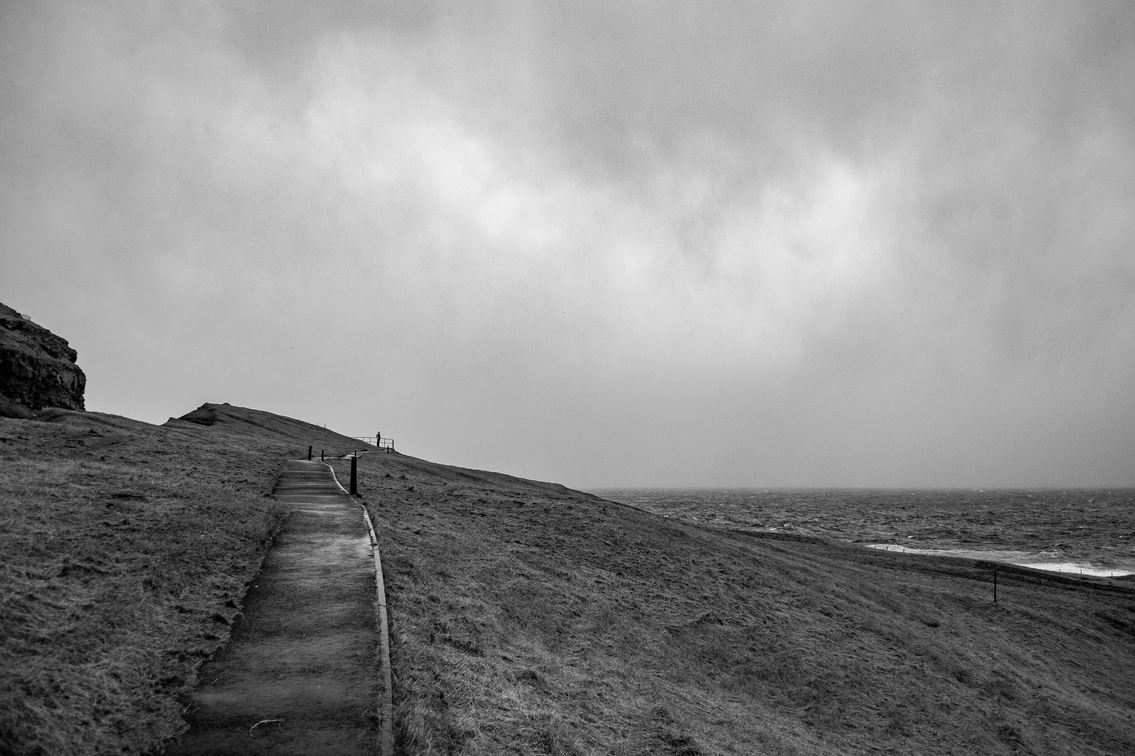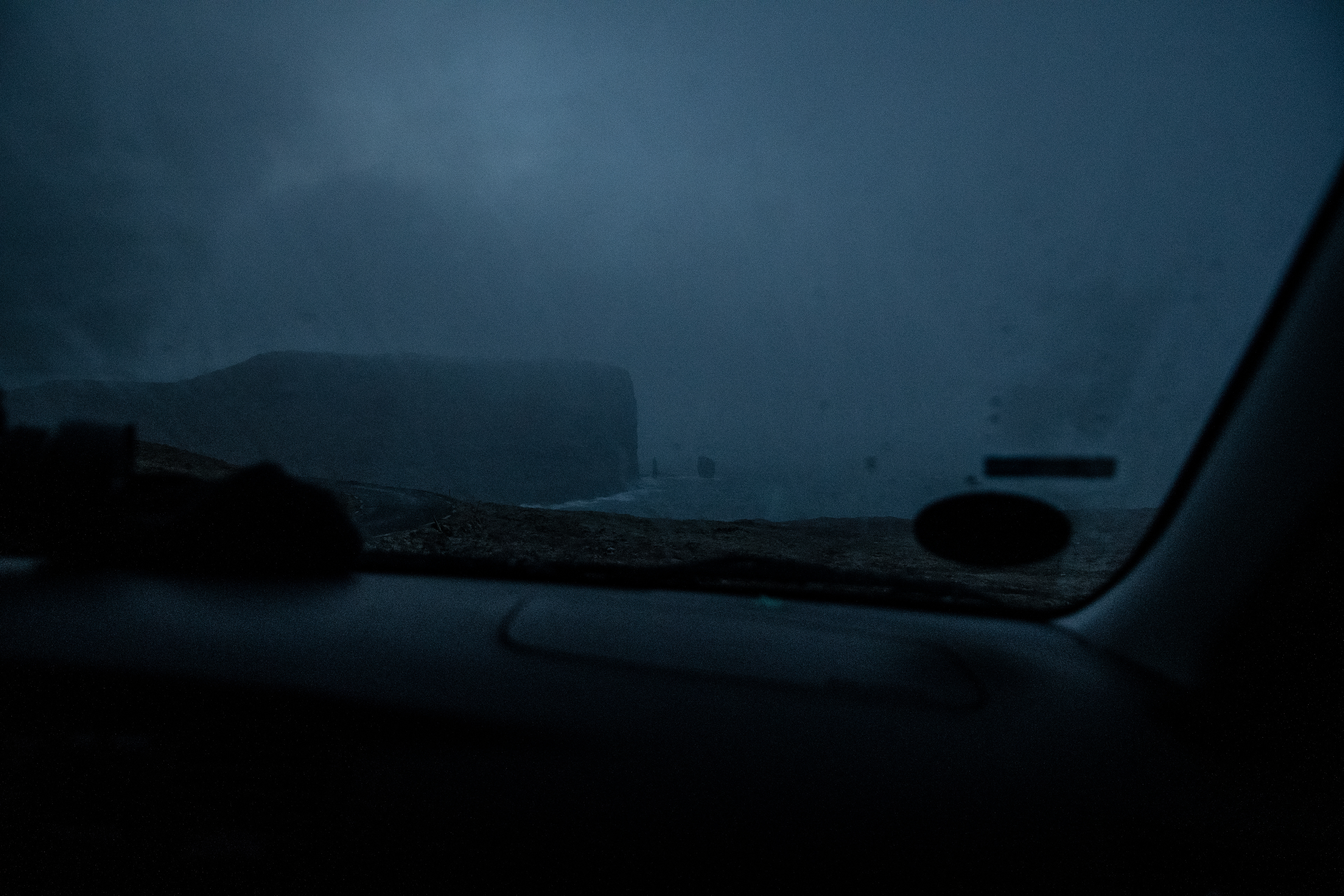Un temporale ci coglie di sorpresa poco prima di giungere al celebre punto panoramico (una delle numerose Mecca per fotografi del luogo) di Drangarnir. La pioggia rende il terreno ancora più difficile da navigare e l'erba bagnata rende i declivi sdrucciolevoli, decidiamo quindi di abbandonare le perigliose verticali della costa meridionale e tornare alla roulotte. Il sole inizia a svanire rapidamente dietro una fitta coperta di nubi rivelando le morbide ombre del paesaggio aspro.