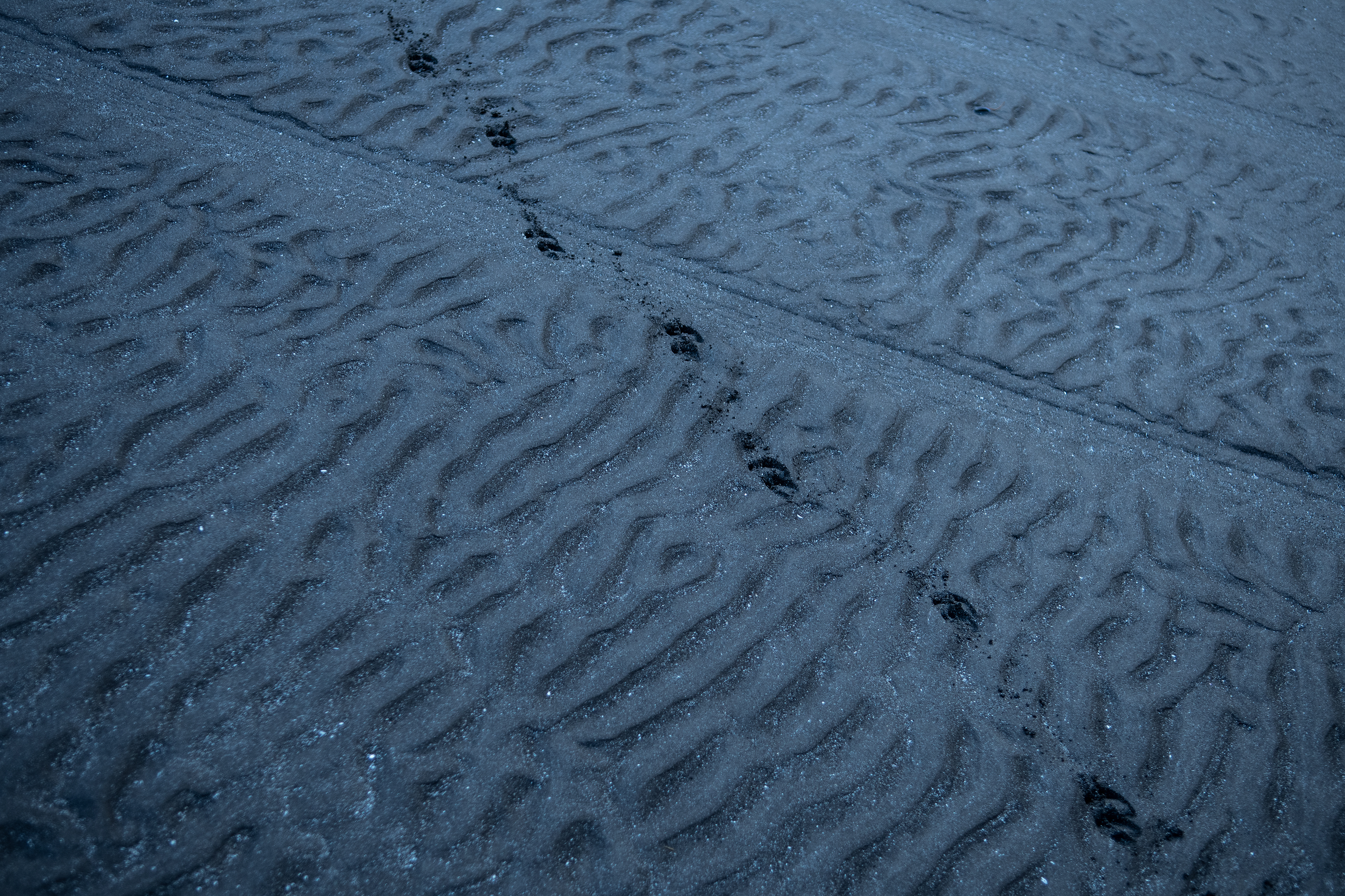 Raggiungiamo la piana giusto in tempo per poterla attraversare senza grossi problemi. Le dune nella sabbia rispecchiano alla perfezione i moti delle correnti a cui questa zona è soggetta, pare un esempio uscito direttamente da un libro di sedimentologia. Nell'ampio fondale di sabbia nera si notano solo le fresche tracce di pneumatici dell'auto di un pastore e le impronte delle sue pecore che ora passeggiano insieme a noi sulla piana.