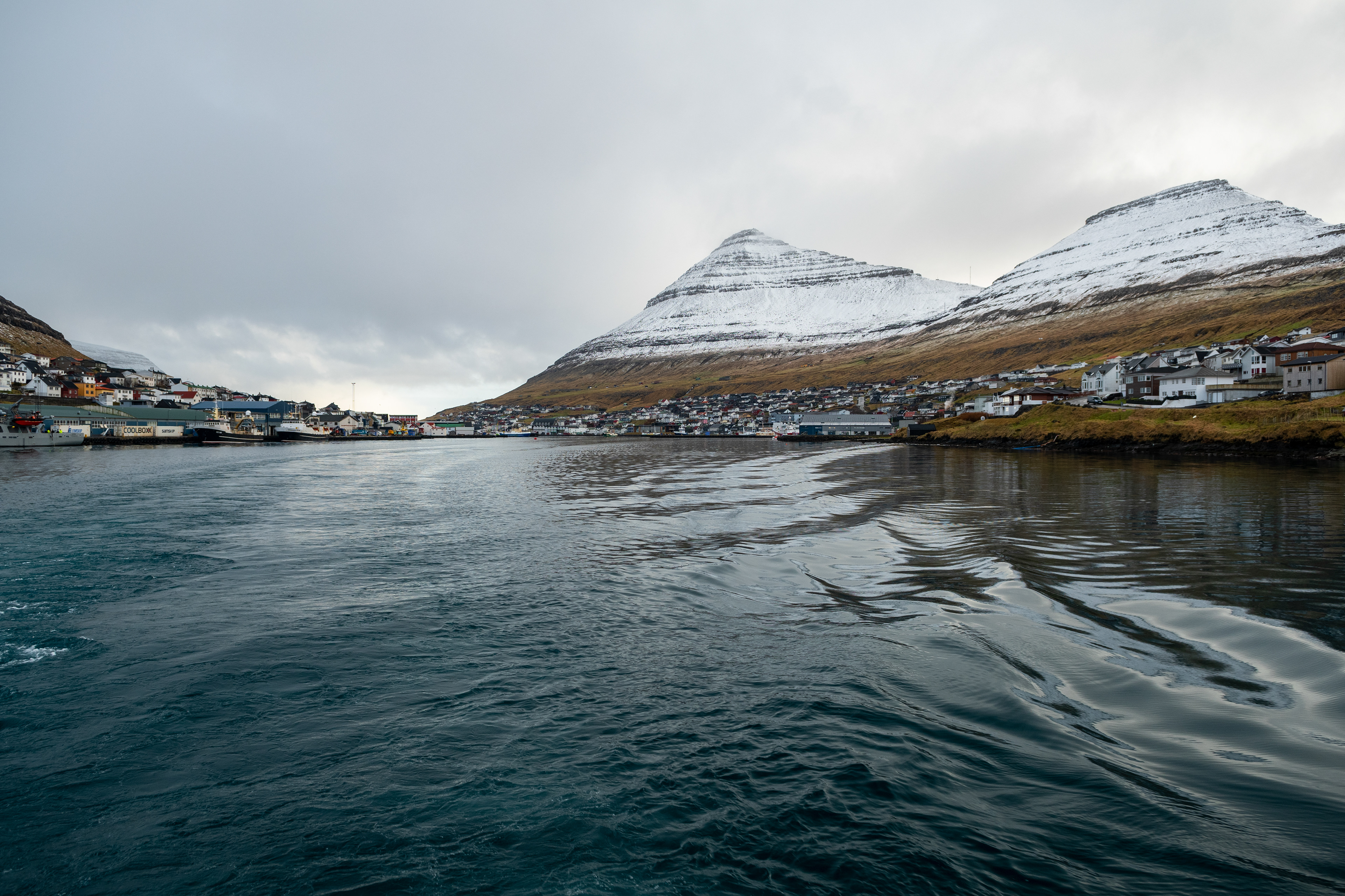 Il porto di Klaksvik è stupendo e le case lo circondano inerpicandosi sul fiordo protetto in cui la città riposa. Tutto pare tranquillo e accogliente qui, i pescherecci ondeggiano piano e nell'aria di cristallo che sa di neve e oceano c'è profumo di pesce, nafta e salmastro.